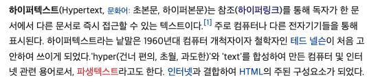 하이퍼텍스트의 의미를 구글링 해 보면, 최상단에서 위키백과의 정의를 만나볼 수 있다.