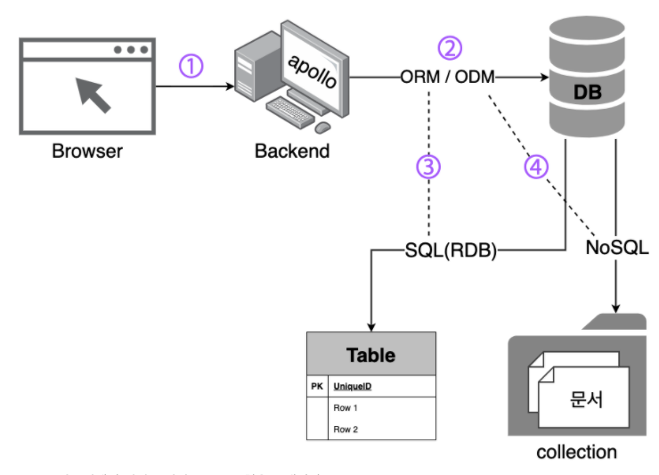 2. 요청을 받은 백엔드가 DB 서버와 소통하기 위해 ORM / ODM 을 사용하게 되며