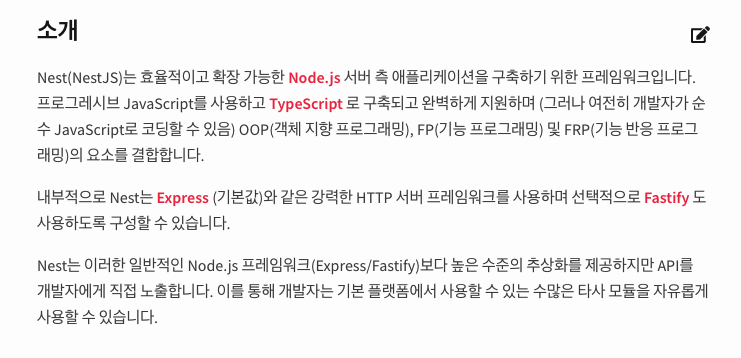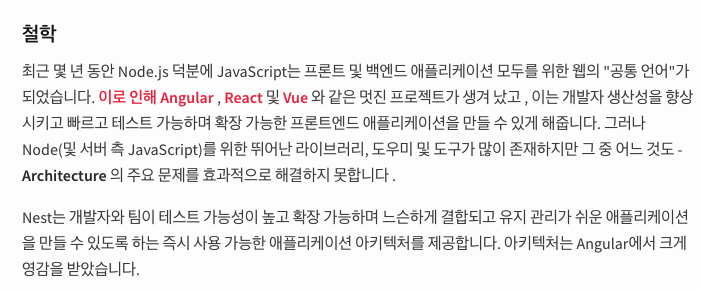 Nest.js 공식 Docs 페이지 에서 확인해볼 수 있는 첫 소개글이다.