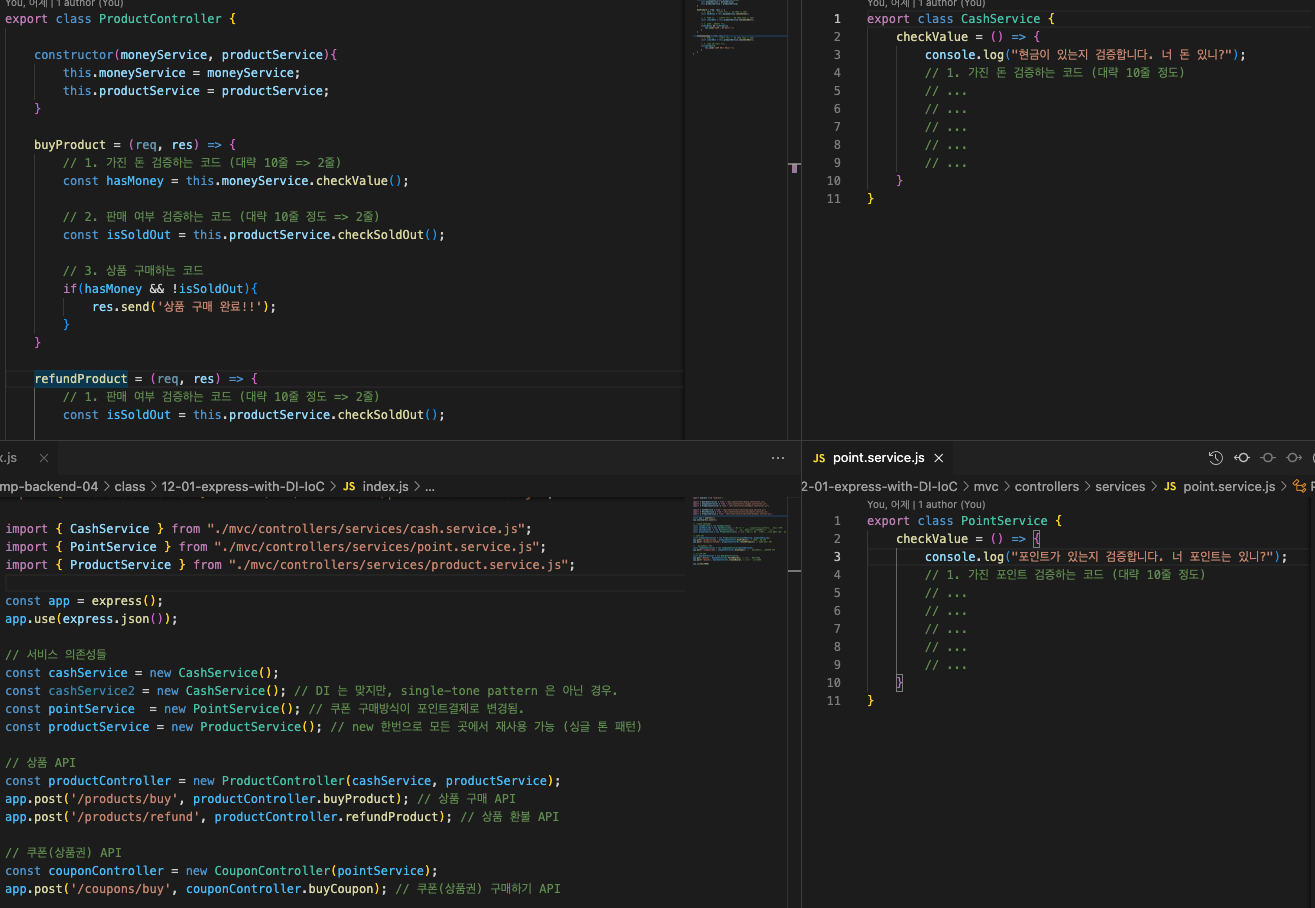 ProductController 는 CashService 와 ProductService 에 '의존하고 있다' 라고 표현한다.