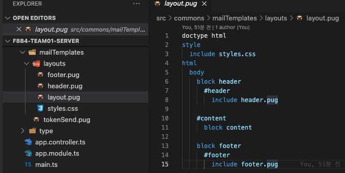 nest mailer 에서 지원하는 template 중, 'pug' 라는 템플릿을 사용하여