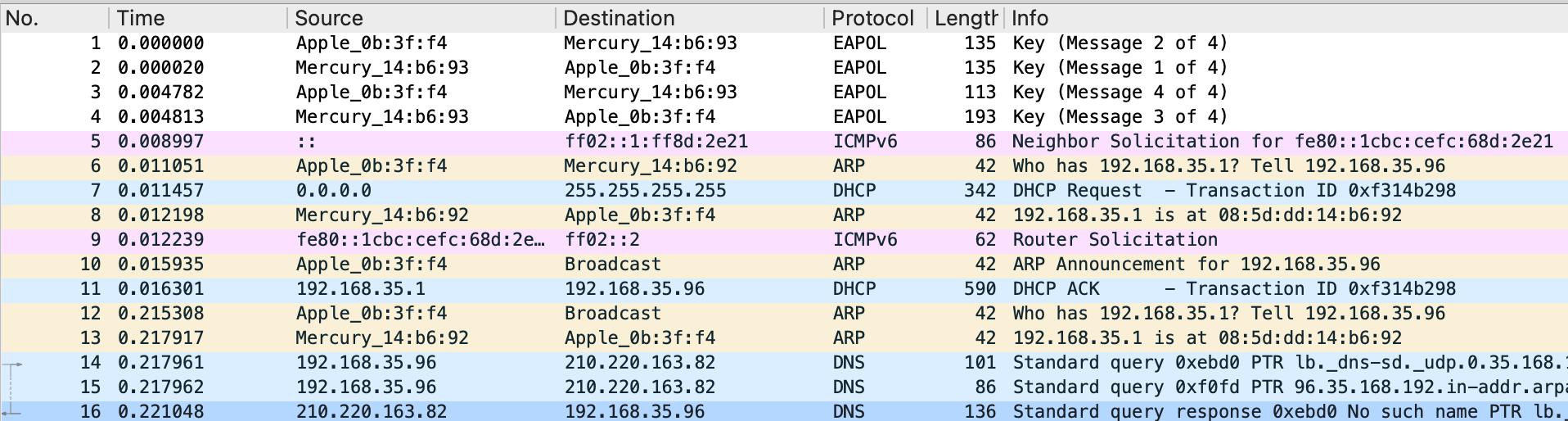 EAPOL 이라는 프로토콜을 통해 4-Way handshake 로 wifi 인증 과정을 거쳐