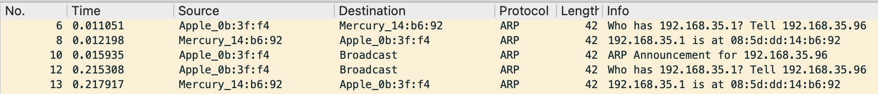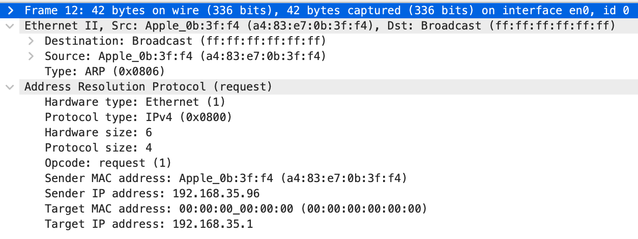 Target IP address (캡쳐에선 192.168.35.1) 를 가진 기기의 MAC 주소를 요청하고
