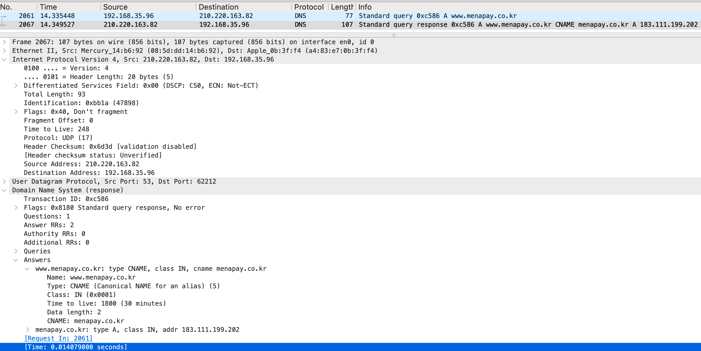 위의 DNS 패킷을 보면 사용하는 프로토콜 (UDP), 요청 도메인의 IP 주소 등이 응답으로 나오는 걸 알 수 있다.