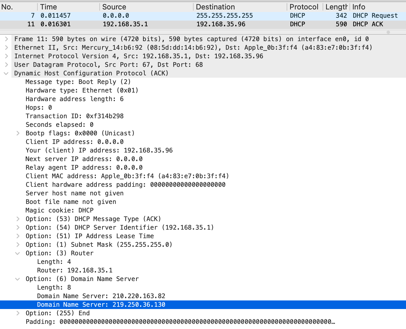 위와 같이 DHCP 의 Type 에 따라 Option 값이 다르게 나타나며, 위의 패킷은 DHCP ACK 패킷으로,